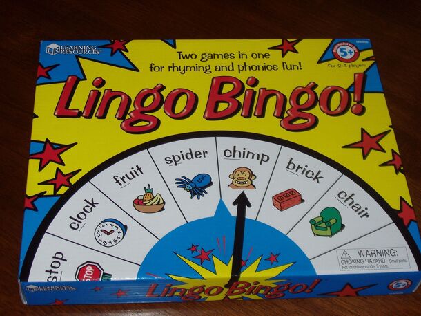 Two phonics bingo games in one. The picture tiles and spinner are double-sided. To play Rhyming Bingo, use the tile and spinner sides with the black border; to play Word Beginnings Bingo, use the sides without the black border. Rhyming Bingo: one player spins and reads the word out loud. All players check their bingo cards for a word that rhymes. 3 markers...