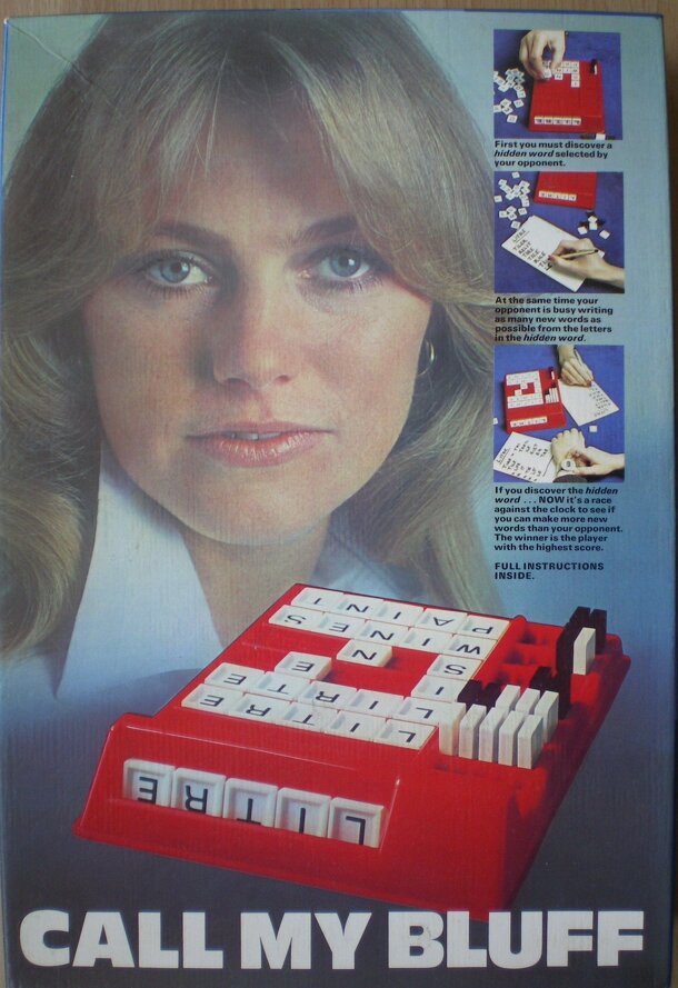 In Call My Bluff, one player creates a secret five-letter word, then the other player takes turns guessing letters in the word as well as whether they're in the proper location, similar to Mastermind. But while one player is guessing, the word creator is secretly listing words that can be created from the letters in the goal word. After guessing that word...