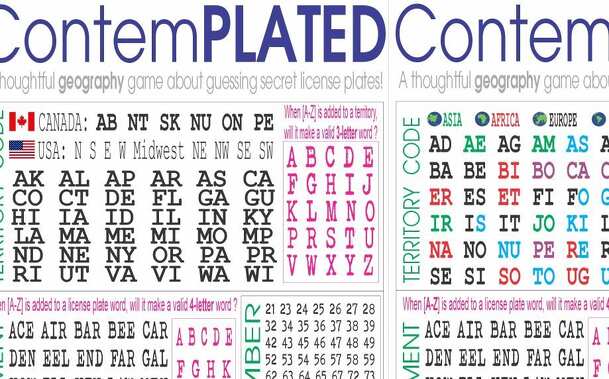 ContemPLATED is a dry erase deduction game about guessing worldly license plates. It is also a geography game as players learn about global ISO-2 country codes and country locations. Components: 2+ Dry erase cards 2+ Dry erase secret holders Setup: Give each player a game card, secret holder and marker. Fold the secret holder such that the sides are at a...