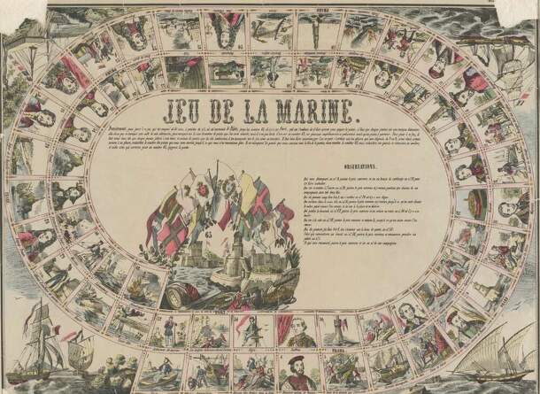 French 19th century roll-and-move board game, similar to the Game of Goose, with 63 numbered spaces spiraling into the centre of the board. Players roll 2 dice and move that total number of spaces. Bonuses and penalties are incurred on some spaces, as detailed by text in the middle of the board. The theme of the game is a naval expedition. Spaces represent...