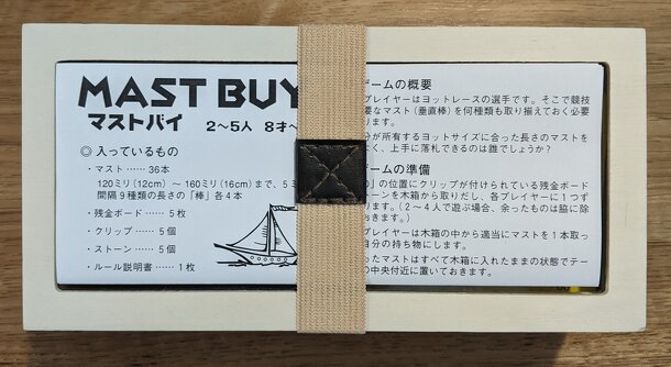 MAST BUY is an auction game where the players are athletes in a yacht race and must purchase the masts they will use. The "masts" in the game consist of a set of small wooden dowels between 120mm and 160mm in 5 mm increments, with multiple of each size. Each player starts the game with 50 money, marked on a board, a random mast, and a blue stone. On a...
