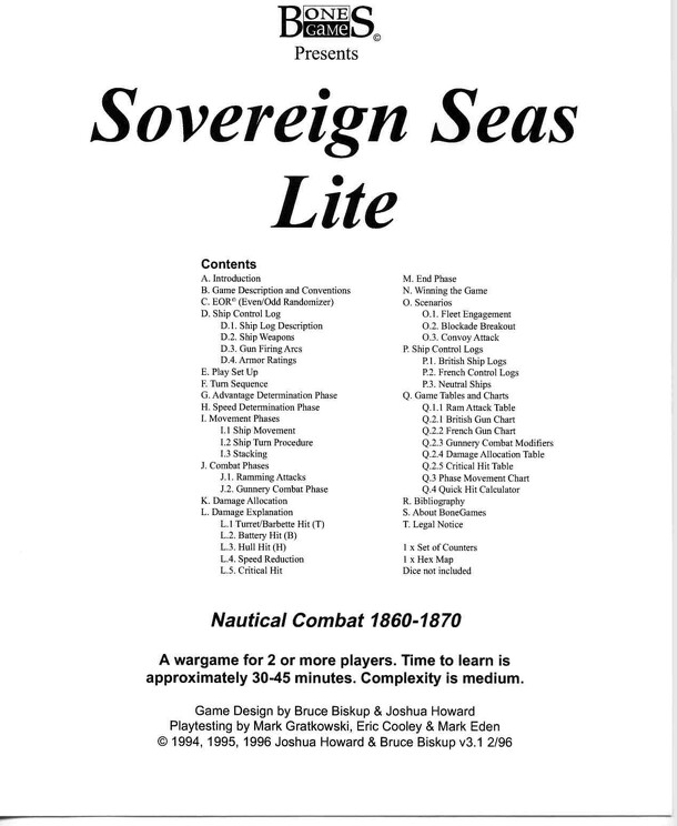 Sovereign Seas Lite is a nautical combat war game which simulates the period from 1860-1870. Sovereign Seas Lite is intended for 2 or more players. Complexity is medium. Time to learn is from 30-45 minutes. Sovereign Seas Lite is the early descendant of Queen Victoria's Navy, a significantly updated and more refined game that covers naval combat from 1860...