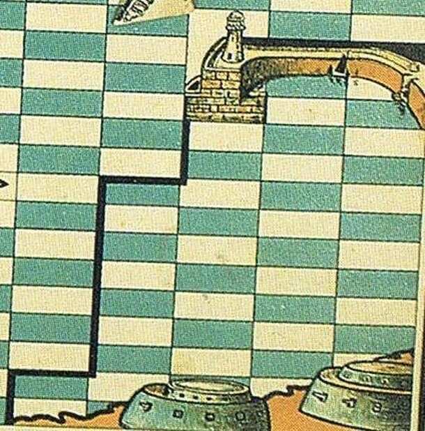 The gameboard shows 3 islands, 6 ships and two opposing fortified harbours with their areas marked off with blacklines. This game was published shortly before the outbreak of the First World War in 1914. It requires the Red Fleet to move its transports from one safe harbour to another while under the protection of battleships, destroyers and cruisers. Its...