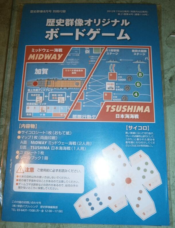 Solitaire wargame for the battle of Tsushima in 1905. This game published with Japanese history and military magazine "Rekishi Gunzo" #114 the Twenty Anniversary Issue. Player control Imperial Japanese fleet and fight against Russian Baltic fleet. The start of the game, player decide turning position against Russian fleet. Then repeat five bombard stage...