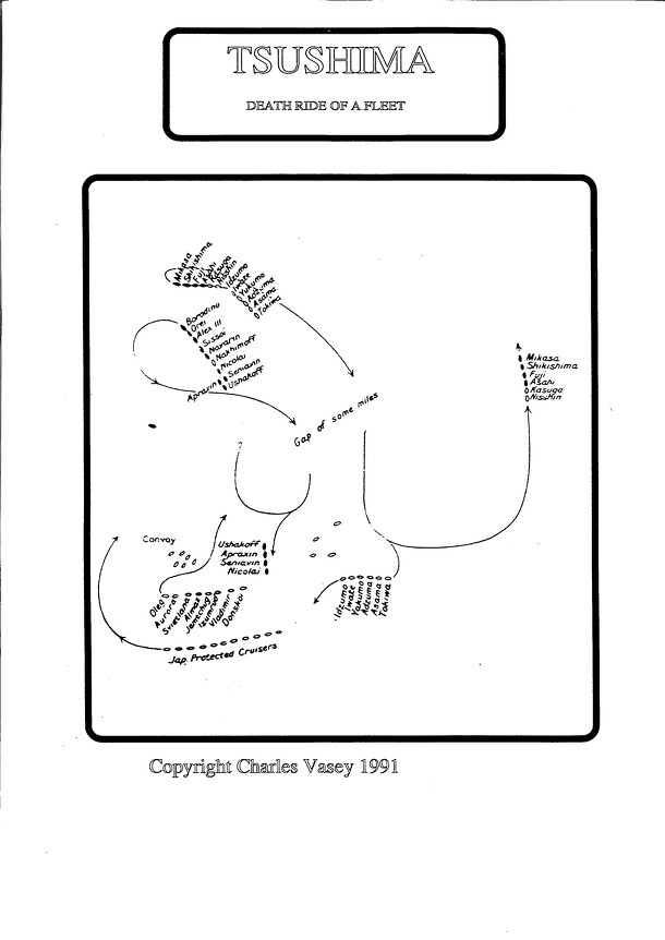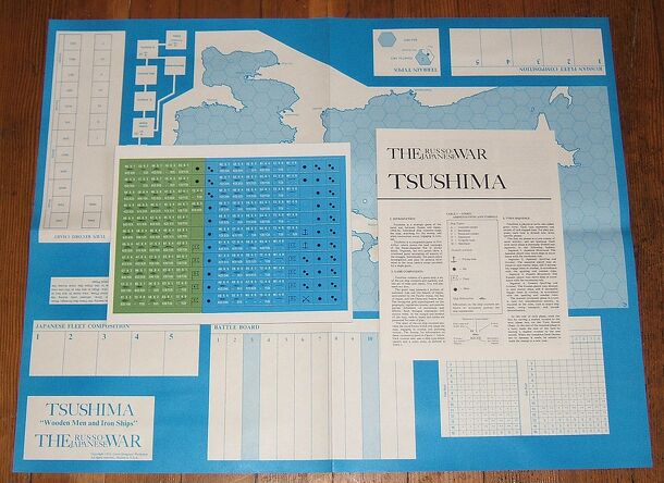 A two-player simulation of the naval battle of Tsushima in the Russo-Japanese War. The game is based upon (or inspired by) Ben Knight's Command Magazine #8 title: Jutland: Duel of the Dreadnoughts. The game scale is twelve (12) minutes per turn, one (1) nautical mile per hex, and individual counters represent divisions of 2-5 ships (4-10 for destroyer...