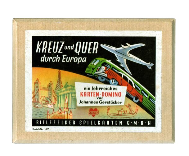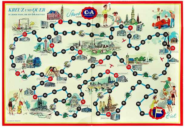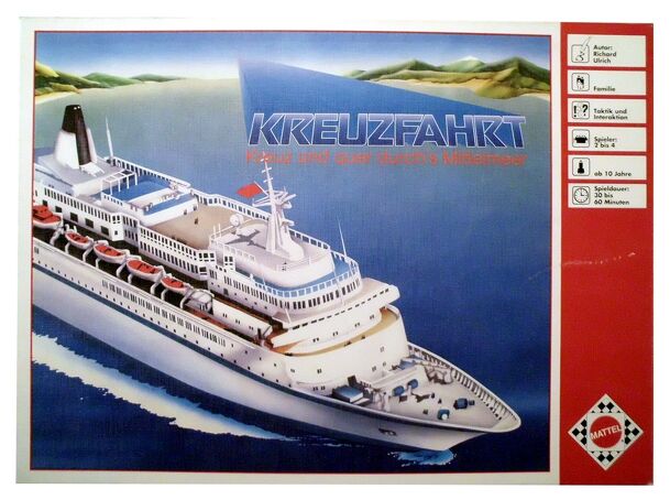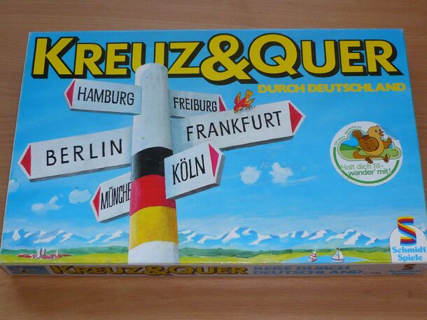 The goal is to be the first to get from the starting point in Garmisch-Partenkirchen to one of the 5 northern spaces at the top of the board. Moves are determined by the spinner on the upper left side of the board. The spinner shows numbers between 1 and 6 as well as the four directions (N, E, S, W). Released in the '50s. A later Edition was called Kreuz...