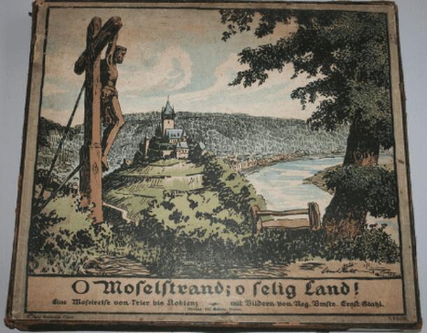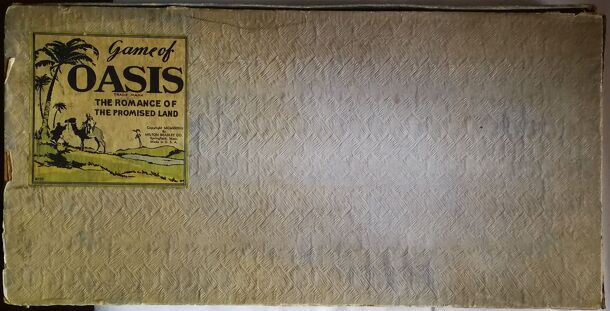 This appears to be a game of Zionist tourism or return to the Promised Land. The box measures 19 1/8" by 9 5/8" by 1 3/4". It is finished in a diagonal woven texture in tan with some blue-gray highlighting. In the upper left corner of the lid is a glued-on label. The label depicts an oasis with several palm trees, green grass, a pool of water, and several...