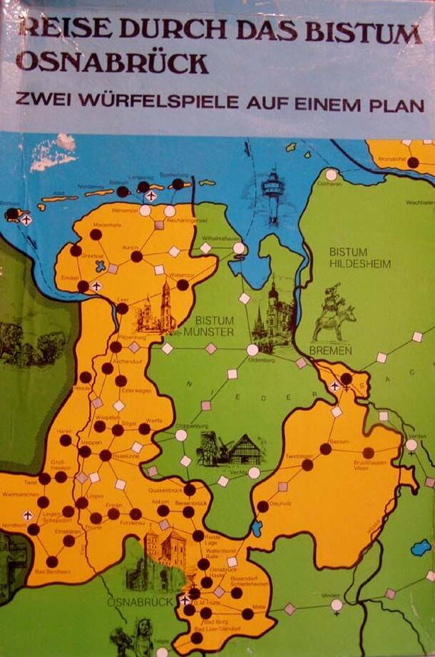 From the box-- Kurzbeschreibung: Das Spiel zeigt das Bistum Osnabrück mit vielen wichtigen und interessanten Orten. Es will Eindrücke und Wissen vermittein. Gleichzeitig ist das Spiel ein schönes Gemeinschaftserlebnis für Kinder, Jugendgruppen und die gesamte Familie. There are cards with this kind of phrase on them: Zähle Frauenorden auf, die in unserem...