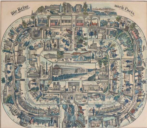The game about traveling by train from Berlin to Paris and return. Objective: be the first reaching start/finish stop called Potsdam Gate (Potsdamer Thor). Roll the die and move forward. If you land on one of the special spaces follow instructions. The game board shows seventy one beautifully executed views (hand colored) of places along the Berlin-Paris...