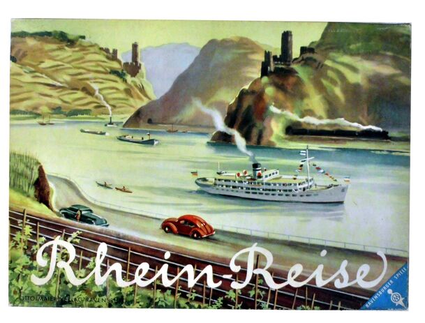 "Die Rheinreise. Gesellschafts-Spiel für die Deutsche Jugend. Neue verbesserte Ausgabe" - The journey along the Rhine. Board game for the German youth. New and improved edition. Object: be the first to reach target space crossing 100 numbered squares. Typical 'roll and move' game. special: along your way to the target you'll pick up tools (umbrella...