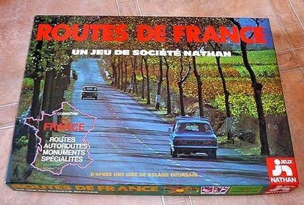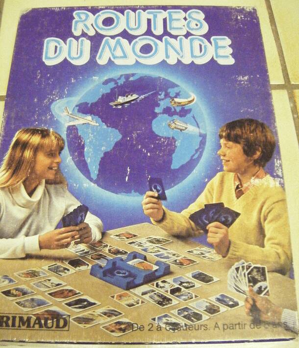 Create routes of cards with photos of places from 56 countries. Cards are valued from 3000 to 10,000 francs, 7 of each. A route starts with a transportation card (bus, train, boat or airplane) and 3 cards in sequence or 3 cards with the same value. A route can be continued by the same player or a partner, but it can be stopped by a blocking card...