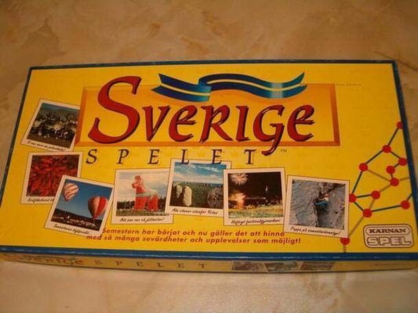 From the rules: A family game with both difficult and easy questions about swedish geography, history, culture and nature. Sverige-spelet is both exciting and educational. Start with dealing out city-cards. Then the players must travel to those cities on the cards they've been dealt. It's important to have a cunning travelplan - and also to be lucky and...