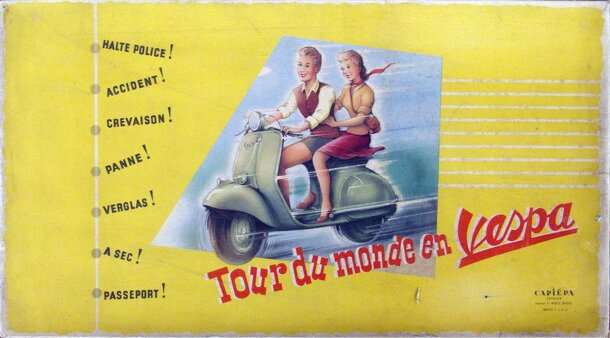 Players travel across a colorful map of the world on their Vespa motor scooters, facing hazards such as accidents, tire punctures, and breakdowns. The game includes 6 metal Vespa game pieces, folding world map game board, rules sheet in French, spinner, 5 wooden continental character figures, one standard six-sided die, one special six-sided "stoplight"...