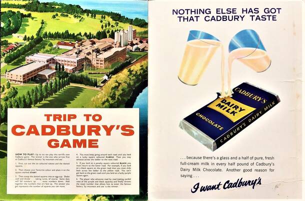 A Trip to Cadbury's Game is an promotional advertising game produced by Cadbury's Chocolate in Australia during the 1960s. The object of the game is to be the first player to arrive at the Cadbury's Chocolate factory in Tasmania, Australia. Players roll a dice and move their colored token the number of spaces along roads around the Cadbury factory. Certain...