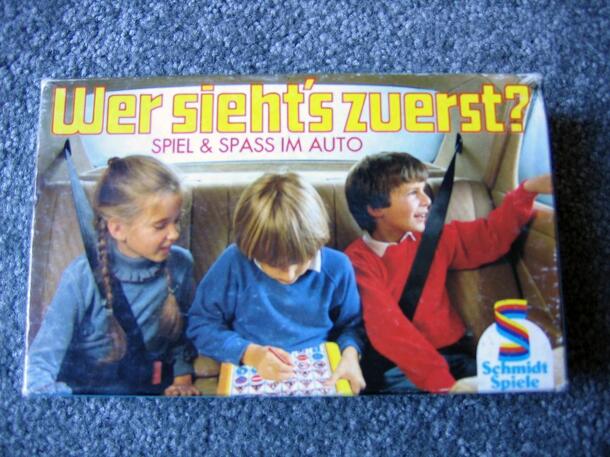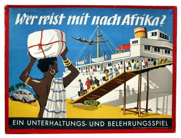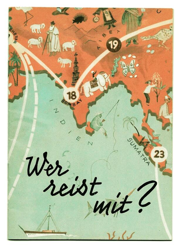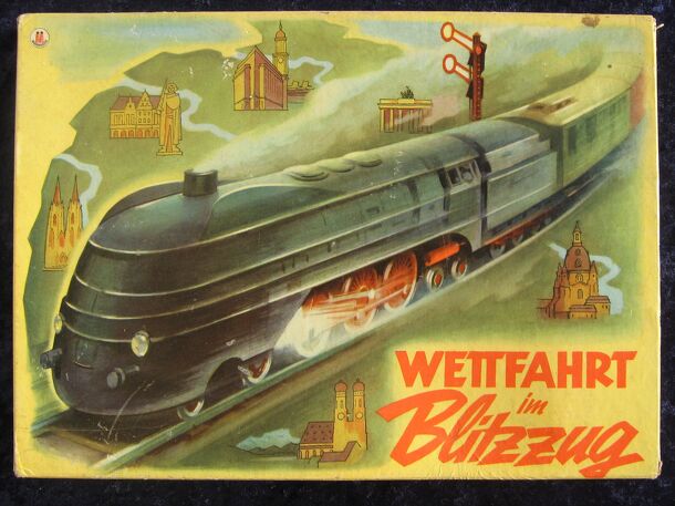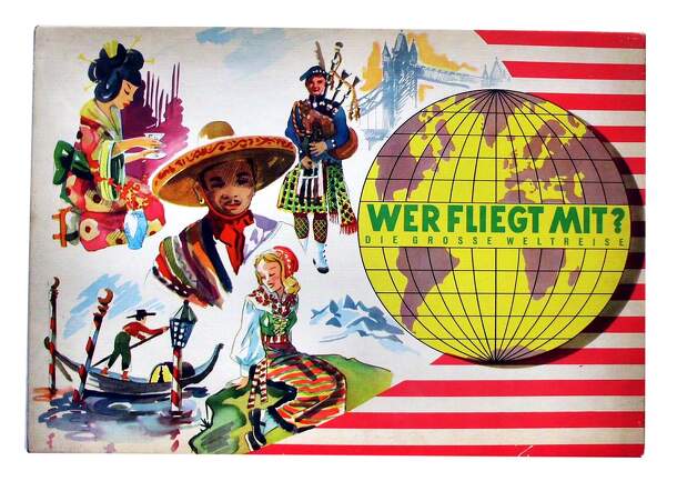 Published circa 1955 (http://www.spielbox-online.de/indxtemp.html?/sbmain/ersatzs.htm). Nice family game where you have to deliver the pre-dealt wooden chips onto the corresponding circles on the board. At the same time you have to visit as much of the 36 cities (each one provided with a card)on the map as possible. These are of 3 different values...