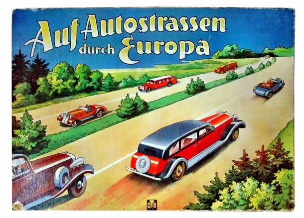 Objective: Be the first to reach Berlin equipment: 6 coloured cars, 35 (city) cards, 2 dice, large board with 35 (numbered) cities, rules inside cover Simple 'Roll and Move' game: Each player starts in Berlin, drawing (city) cards to determine his route Note: 1st edition (before WW II) differs from 2nd edition (after WW II) ==> see images because of the...