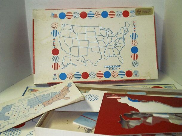 Made by Skelton Shelton Nelson in 1979. Exclusive features of the game include: 7 variations enabling the player to participate at different skill levels, ranging from a simple puzzle, to an entire group participating in an old fashioned history bee; A laminated game board displaying a map of the USA which can be written on and erased; self-check answers;...