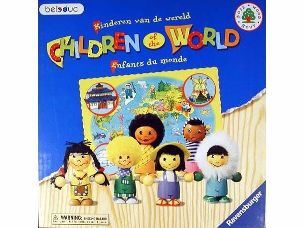 Children of the World - the exciting journey around the world - a dice game for 2-6 players aged 5-8 years. A hefty wooden board with a world map and 6 very nice little wooden dolls (each unique) representing children from the different continents. Each player starts with 5 postcards from his or her continent and attempts to be the first to give them all...