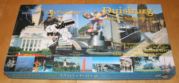 Objective: Using the detailed street map of Duisburg each player is given five companies to be established in the city as close to the centre as possible. With the help of dice and counters, each players chooses where to place, turn or remove company tiles. Once a company is established on the map, the corresponding four 'places worth seeing' are revealed...