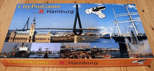 Objective: Using the detailed street map of Hamburg each player is given five companies to be established in the city as close to the centre as possible. With the help of dice and counters, each players chooses where to place, turn or remove company tiles. Once a company is established on the map, the corresponding four 'places worth seeing' are revealed...