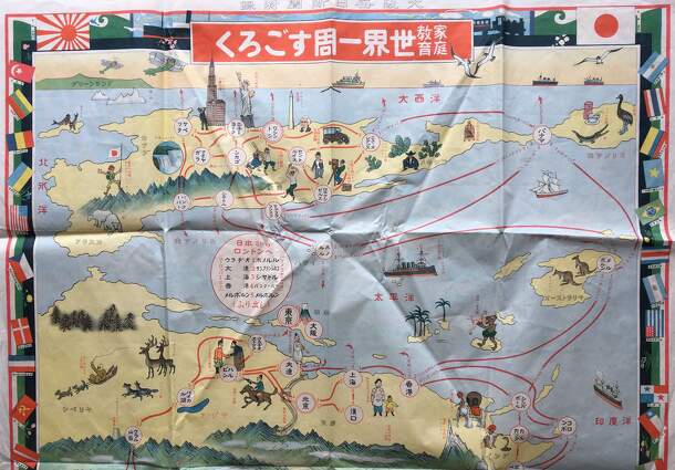 This is a very unusual Japanese travel game published by the Osaka Mainichi newspaper in 1926 (Taisho 15), quite unlike the typical Mawari-Sugoroku board, which has a path of pictures spiralling toward the center. This game is a huge map of the world surrounded by flags. It measures about 43" tall and 30" wide. It is oriented (no pun intended) toward the...