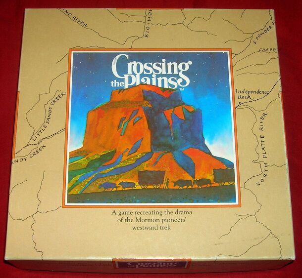 LDS family trivia board game from 1984 - "Crossing the Plains". A Pioneer Trek Simulation Game. Based on the actual experiences of the first Mormon pioneers. Copyright 1984, Deseret Book Company. Contents: Game Board 6 Playing Pieces Dice Crossing The Plains Cards Play Money Supply Record Sheets Instructions For 2 – 6 players, ages 8 to adult. The object...