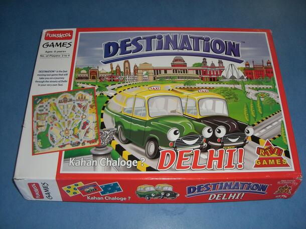 Destination Delhi! is a roll-and-move game where players are taxi drivers collecting fares around Delhi. The game board is a map of Delhi featuring 10 different tourist attractions and players draw destination cards telling them where they must move to next. The attractions are: Rashtrapthi Bhawan Red Fort Bahai Temple Connaught Place India Gate Jama...