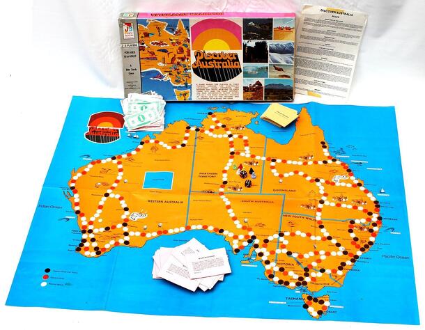 From the box: "A game where the players in their travels around the Australian Continent learn historical and modern day facts relating to each town, city and the many interesting and informative places along the way. The many everyday hazards of travel add to the interest and excitement of playing the game." The board is a map of Australia. Players move...