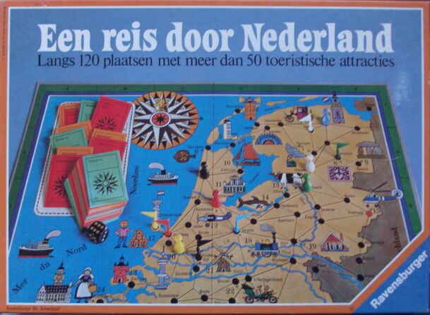 Players race, using the shortest routes possible, through more than 100 cities of The Netherlands and adjacent areas in Germany and France. The first player to return to his starting point wins the game. Contents (1985 edition): 1 board, 1 six-sided die, 6 flags, 6 pawns, 74 place cards, 55 numbered cards for places with attractions, 18 luck cards, 3...