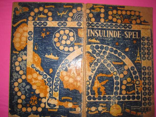 Elaborately illustrated boards table-game featuring the voyage from Amsterdam Central Station via Paris and Genua to the Dutch East Indies. Illustrations featuring trains, Eiffeltower, passengerships and all Islands of the Indonesian Archipelago. Gamers have to pass 68 numerical stations before arriving the final destination. Boardgame with rather...
