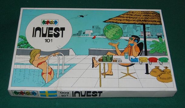 Description from the rulebook (translated from Swedish): Invest is a game for 2-6 players. The players takes of to more southern locations, each with 30 grand, to buy properties where they can build Bungalows and Hotels, giving them rental fees when the other players visits. User summary: It is essentially a Monopoly-clone but with lots of 1970s...