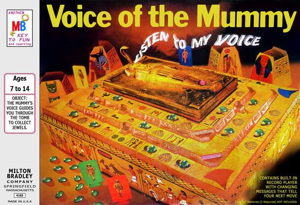 Players move around a multi-level pyramid collecting gems; small battery-powered record player inside sarcophagus at the center of the board instructs players who land on certain spaces on their moves or gem collecting. Once the Great Jewel is removed from sarcophagus (along with the evil cobra-shaped Spell), the record is turned over, and the game becomes...