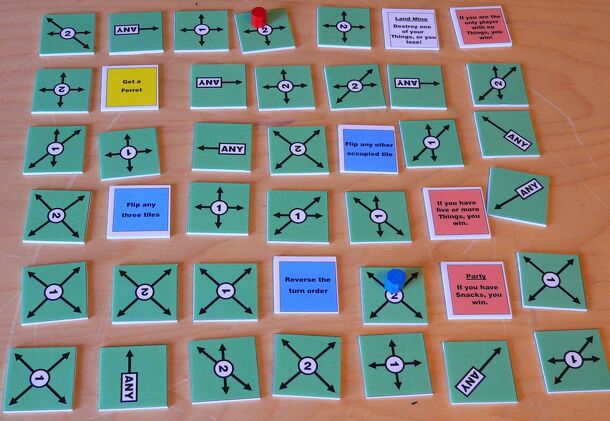 In Wanderlust, you are racing through an arrow maze, trying to pick up the right Things and take those Things where you can win with them. The playing area consists of a 6x7 grid of double-sided tiles. On one face, the tiles display the possible moves and on the other, places for winning and actions available to the players. After having done the action or...