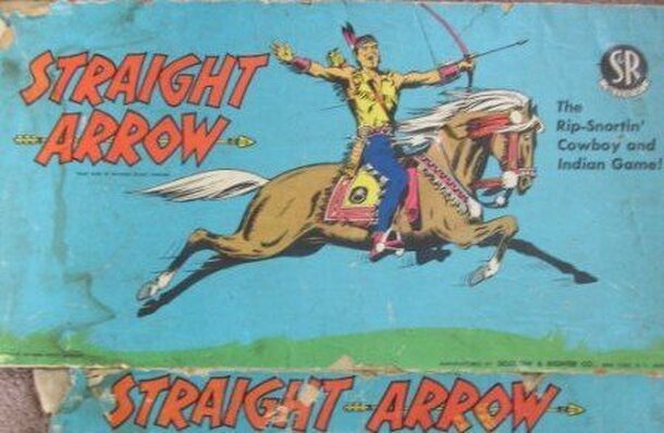 Straight Arrow (trademark of national biscuit company) is a 1950 game manufactured by by Selchow & Righter co. The directions are printed on the inside of box cover. The gameboard contains a track which all players follow as the spin and move, and measures approx. 18-1/4" x 18-1/2". Players attempt to earn golden arrow tokens as they move along the board...