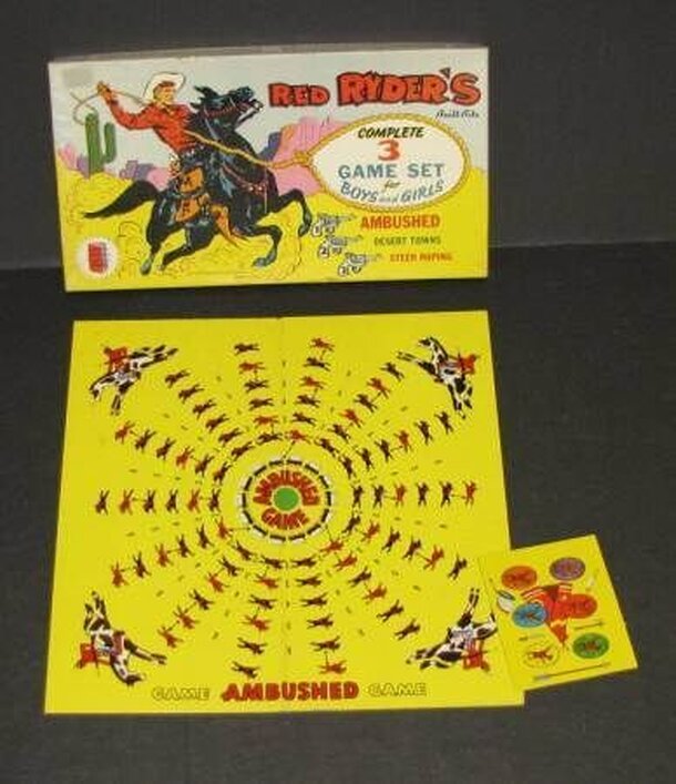 An early children's game based on the long running TV series of the same name. This game was published shortly after the beginning of the TV series which ran from 1959 to 1966. Although the show is best known for having Clint Eastwood, the star of the show was Eric Fleming who appears on the box cover of the game. The game is a basic roll and move game...