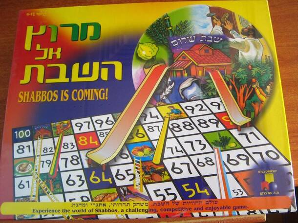 This is a children's game published in Hebrew and English which has a religious theme focusing on preparation for Shabbos or Shabbat, which in Judaism is the Sabbath day (day of rest). The game is similar to a chutes and ladders style game, with players moving up ladders and down slides to move from the bottom to the top of the board. The board uses...