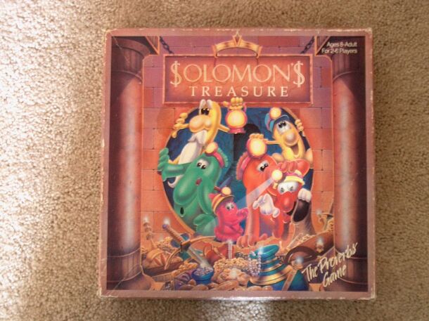 This is a family game where each player is a "verb" traveling though the mines of Solomon trying to find Solomon's Treasure. King Solomon (from the Old Testament) was both a very wise and very wealthy king. In this game you are both seeking his monetary treasure and learning from his treasure of wisdom as found in the book of Proverbs. The game is for Ages...