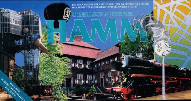 Objective: Using the detailed street map of Hamm each player is given five companies (each divided in 4 pieces/tiles) to be established in the city as close to the centre as possible. With the help of dice and counters, each players chooses where to place, turn or remove company tiles. Once a company is established on the map, the corresponding four...