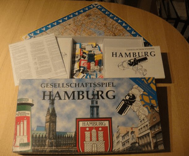 Objective: Using the detailed street map of Hamburg each player is given five companies (each divided in 4 pieces/tiles) to be established in the city as close to the centre as possible. With the help of dice and counters, each players chooses where to place, turn or remove company tiles. Once a company is established on the map, the corresponding four...