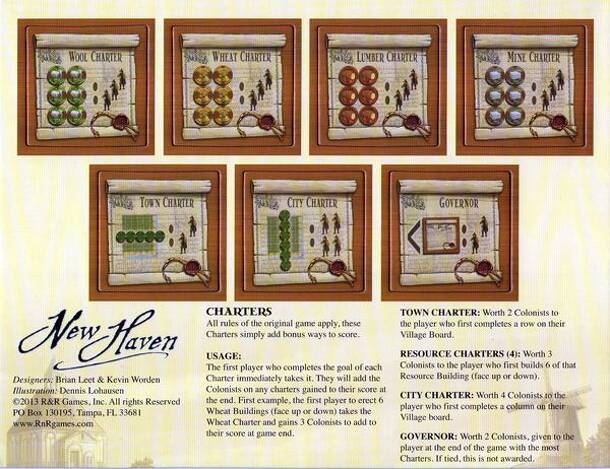 Hen Haven - Urkunden/ New Haven - Charters consist of 7 tiles which can be achieved during the game. These tiles show different conditions you have to reach to get additional victory points. They are scored for being the first to: - Complete a row of buildings on your Village board - Complete a column of buildings on your Village board - Build 6 buildings...