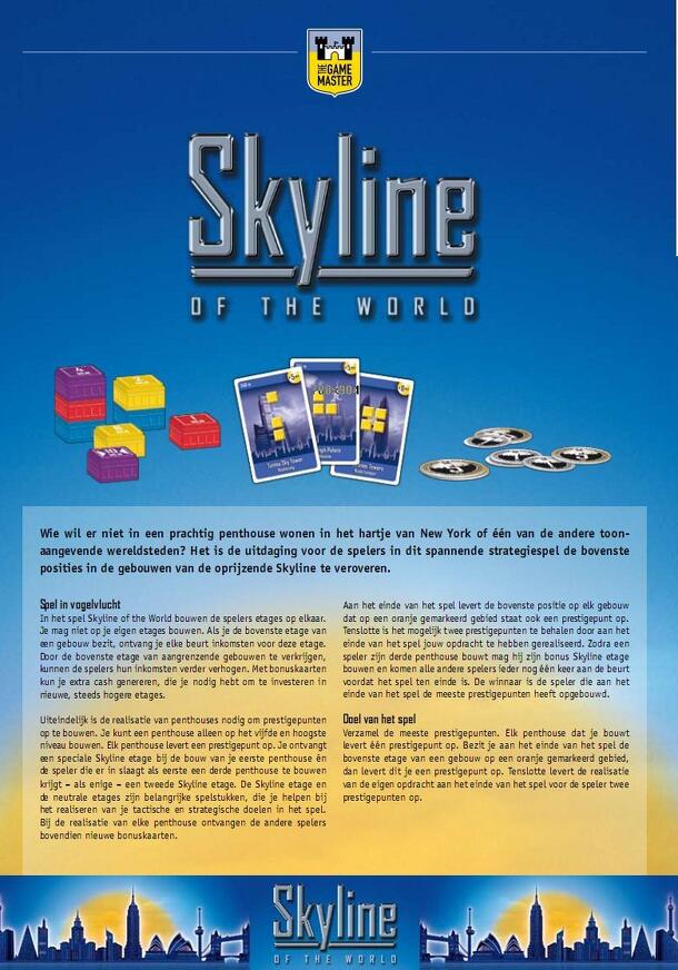 Who does not want to live in a beautiful penthouse? New York, Sydney, Shanghai, London, Rotterdam, Frankfurt or one of the other great cities? It is the challenge of the players who participate in this exciting game to strive for the highest position in the skyscrapers that form the ever rising Skyline. Which player succeeds in finishing the first...