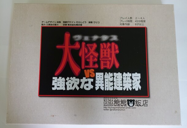 大怪獣ヴェナタス VS 強欲な異能建築家 (Daikaiju Venatas vs Goyoku na inou-kenchikuka) is a game from Japan with players constructing properties and sending monsters to destroy the opponents' buildings. Over 6 rounds, players place cubes in the different sectors of the city. As buildings are constructed, the land prices rise in the sectors. Then the players send Godzilla...