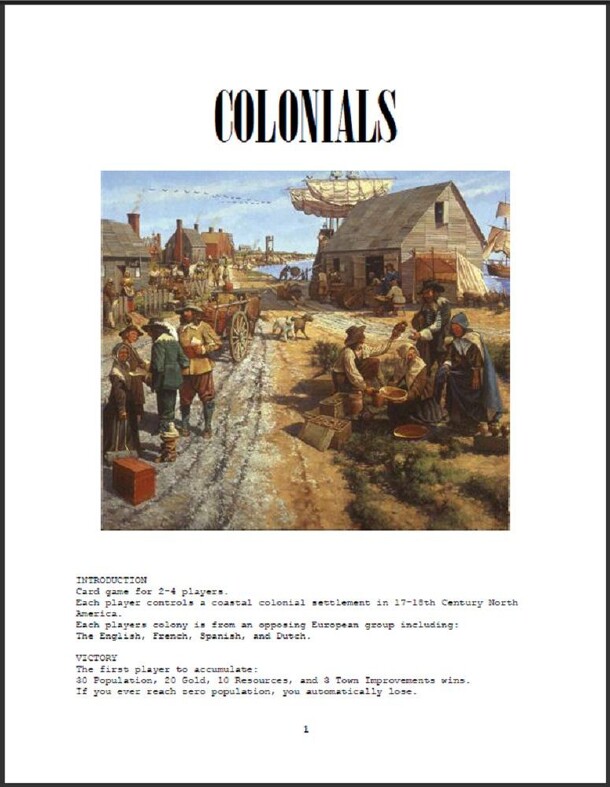 “Each player controls a coastal colonial settlement in 17-18th Century North America. Each player’s colony is from an opposing European group including: The English, French, Spanish, and Dutch. Victory: The first player to accumulate 30 Population, 20 Gold, 10 Resources, and 3 Town Improvements wins. If you ever reach zero population, you automatically...