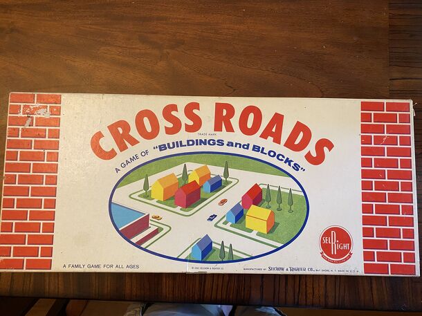 In the game of "cross roads" each player becomes one of the builders of a "town". The center of the Playing Board is a map of the Blocks and Crossroads of this "town". The Blocks are divided into square lots and are zoned in color as to the type of buildings or landscaping that is permitted on each lot. The "town" is divided into two, three or four lot...
