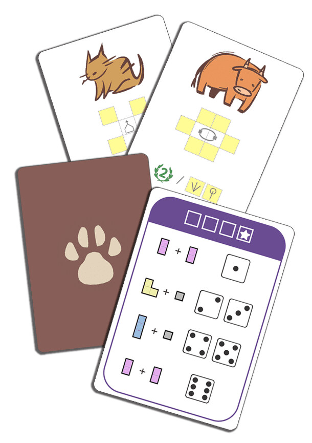 Dice Tiny Town Duel: Animal includes 2 modules. The Animal module adds a new scoring element: animal points. Each game, you draw and use two cards among 8 animal cards. Recommended for experienced players who are already familiar with the base rules. This module is also compatible with "Dice Tiny Town (2023)". The Split Shapes module adds new shape cards...