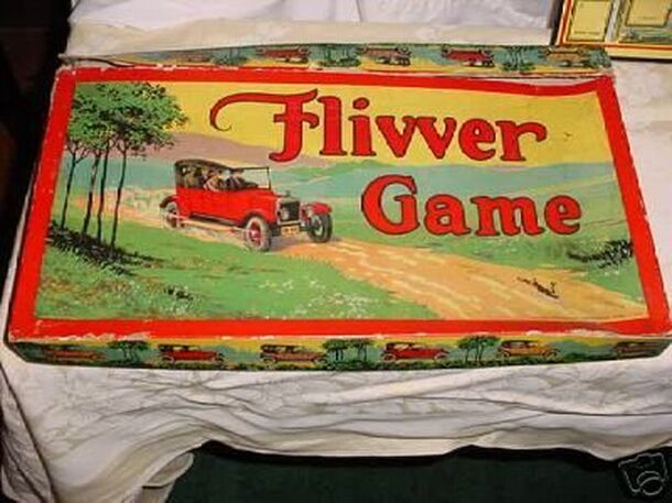 The game box is 6 1/4" by 4 1/4" and 1" deep. The box contains: Four die cast touring cars A spinning wheel board (to generate random movement number) A one page rulebook. The game is about racing in Ford "Flivver" (Model T?) cars. The game is played by spinning the "rear wheel of the Ford indicator" and moving the indicated number of spaces. Text on...