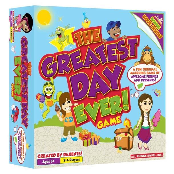 From the carnival, to the toy store, to a big beach party, find your friends and presents as you race around the coolest board ever enjoying the greatest day ever in this original and unforgettable matching game. Object is to be the first player to match Your 5 cards with any of Your 8 friends and presents. Contents: game board 40 playing cards 15 friend...