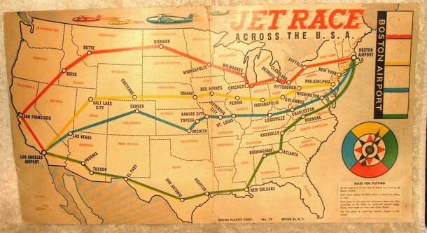 Each player begins with their plane in the Boston airport. The winner is the first plane to reach LA. It is simple spin and move game. This game doesn't seem to have been packaged in a box. The planes "snug" into tabs on the board, and the spinner is part of the board. Rules from the game board: At the begging of the race all planes are lined up at Boston...