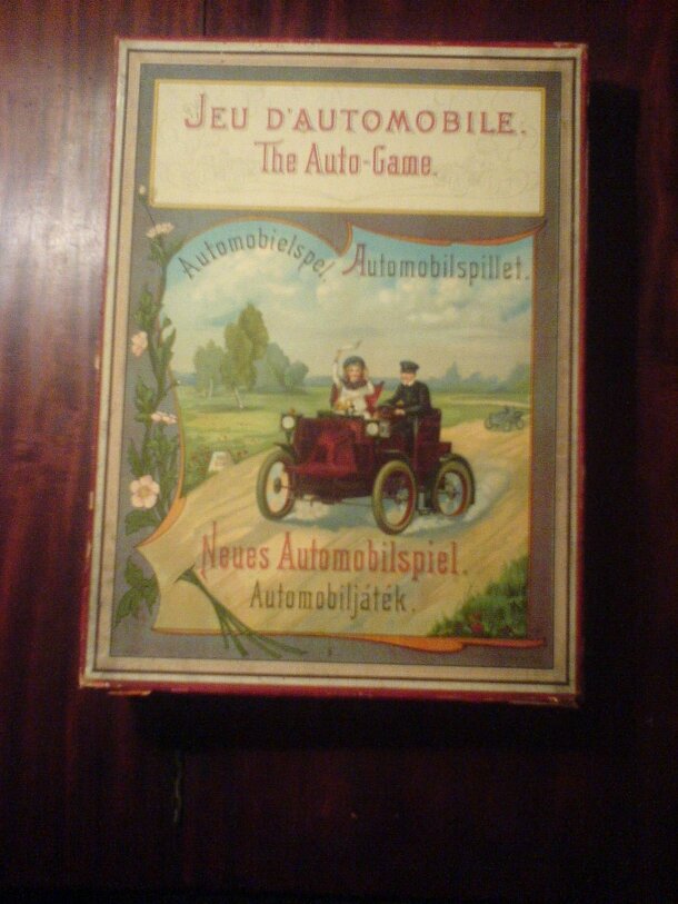 Players move their counters which represent automobiles along a track which represents countryside. Landing on hazards delays their trip. There is nothing original to the game itself but the incidental art and particularly the detailed die cast metal early autos create a nice feel for the early days of motoring. The rule book states it is printed in...