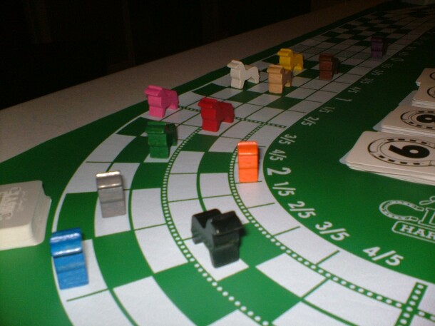 A card-driven horse race game in which players secretly bet on either a winner, a second-place horse, or a double of the two. Each of the four horses can be moved by any player. Some of the cards allow specific movement of one horse a number of spaces; the rest of the cards can move any of the horses, but only one that is in a certain position in the race...